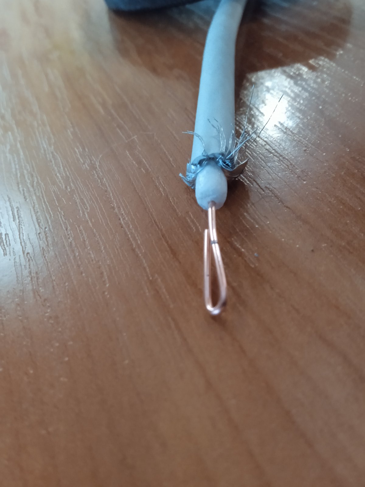 Замыкаем обнаженный конец на этот разрез, закручивая наши приготовленные 5 см нагого провода вокруг экрана. Получится такое кольцо из кабеля.