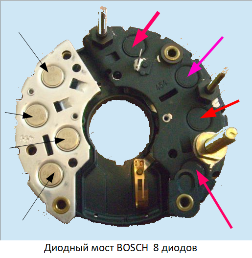 На многих современных генераторах используются диодные мосты 8 диодов, но уже без дополнительных диодов. DENSO, BOSCH, Митсубиши