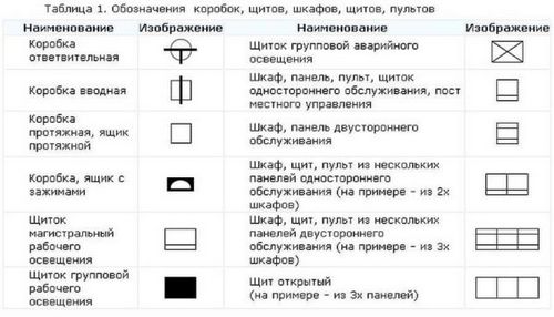 Обозначение электрических частей на схемах: шкафы, щитки, пульты