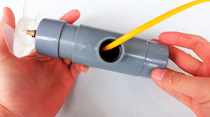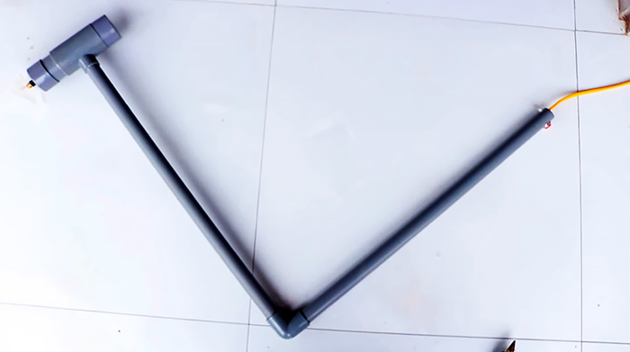 Еще одну такую трубу соединяем с предшествующей угловым фитингом на 90 градусов. Все соединения необходимо проклеить. На конце последней трубы сверлим отверстие под кнопку-тумблер для электропривода.