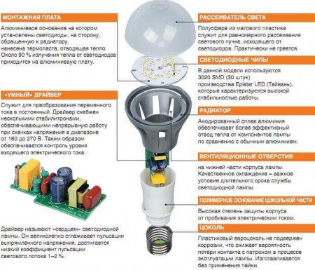 Корпус изготавливают из пластика, стали, сплавов алюминия. Пробирка, в какой находится плата с диодиками, не герметична и не заполнена ядовитыми газами. В устройство лампочки заходит драйвер.