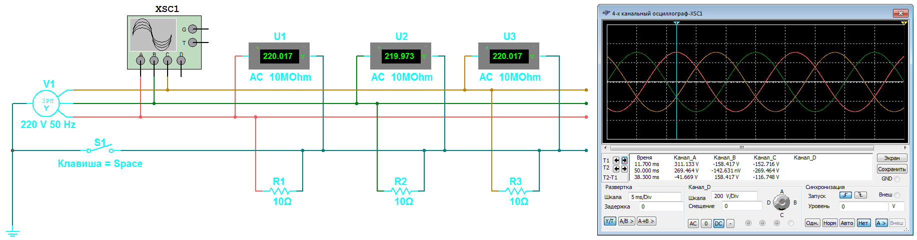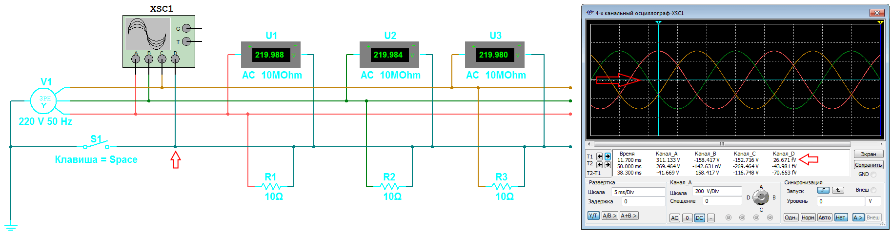 Ротор генератора, вращаясь, делает электродвижущую силу, которая при условии, что цепь замкнута, принуждает свободные электроны в проводах направленно передвигаться от зоны с огромным потенциалом (излишком электронов) к зоне с наименьшим потенциалом (недочетом электронов). Давайте условно остановим время и разглядим что происходит с напряжениями в каждой фазе. Нам понятно, что напряжение в розетке между фазой и нулем 220 Вольт. Это действующее значение напряжения, и после перевода в амплитудное получим 312 Вольт. Примем, что это напряжение на выводе A генератора (либо трансформатора). Для определения напряжения на 2-ух оставшихся выводах также условно примем, что потребление по трем фазам симметричное. Тогда нулевой провод практически не нужен, потому отсоединим его от генератора (трансформатора) — в жизни эта ситуация именуется обрывом (отгоранием) общего нуля. Но ноль у нас никуда не делся. Принципиально осознавать, что ноль — это не просто 4-ый провод от трансформатора. Ноль это прежде всего общая точка соединения 3-х фазных нагрузок. И ток в эталоне не течет от фазы к нулю трансформатора и назад. Ток течет между 3-мя фазами если нагрузки симметричные. И только когда нагрузки несимметричные (а в реальной жизни так всегда) только часть тока по четвертому проводу ворачивается в трансформатор.
