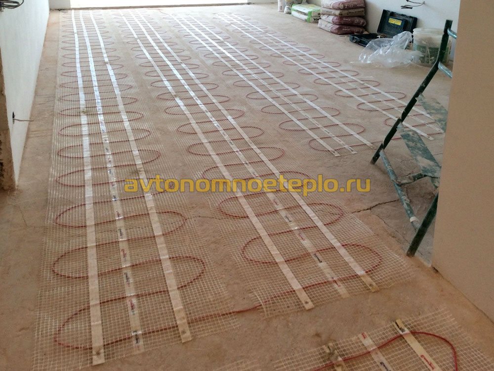 Представляют собой проводник, выложенный в виде змейки и укрепленный на стекловолоконную сетку. Сетка допускает разрезание на секции (при всем этом нельзя нарушать целостность кабеля), обеспечивая свободу в покрытии поверхности пола различных размеров и форм. Нижняя поверхность сетки покрыта клеевым слоем, что обеспечивает резвую фиксацию конструкции к основанию. Укладка такового теплого пола осуществляется, не применяя монтажную ленту. При окончании укладки и закрепления греющих матов производятся нужные соединительные операции и тестирование конструкции.