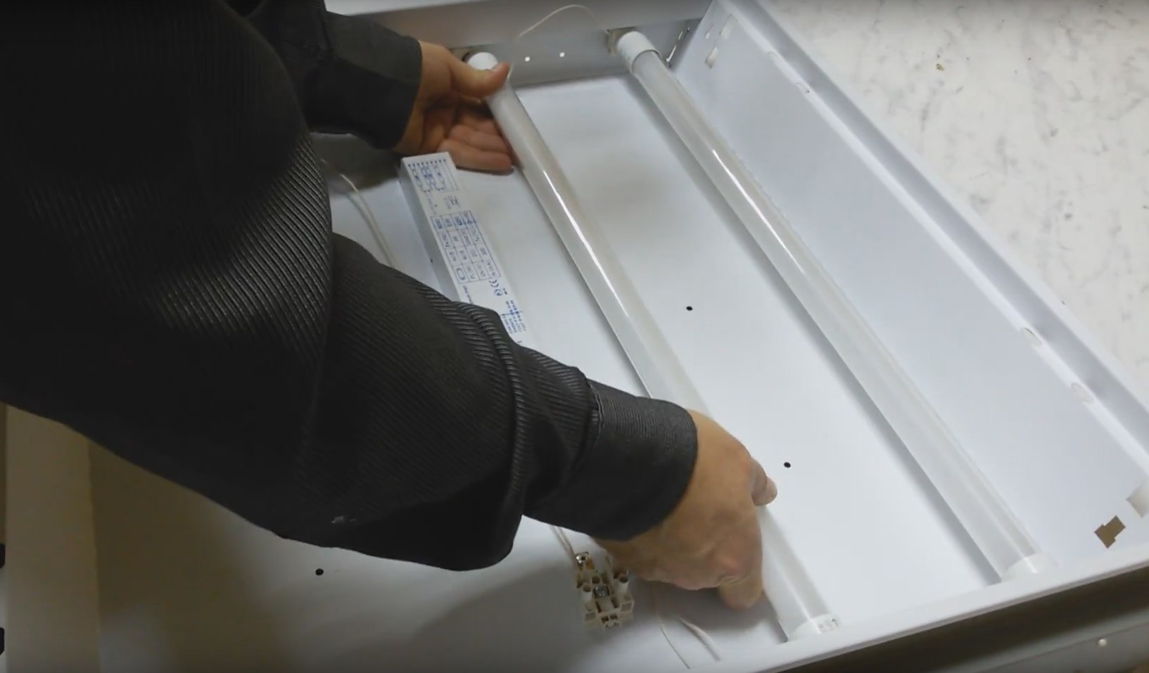 Сразу убираем старенькые лампочки. Берем каждую с 2-ух сторон, поворачиваем под прямым углом, и просто достаем. Будьте аккуратны, не повредите люминесцентных ламп при демонтаже – ведь снутри находится страшная для нашего здоровья ртуть.