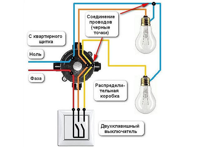 Практическая схема подключения пятирожковой люстры к двойному выключателю