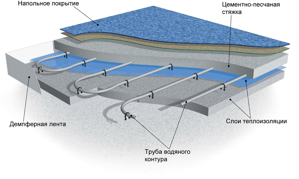 В бетонную стяжку, залитую на слой теплоизолятора, что уменьшает утраты тепла (нам не надо греть подвал коттеджа либо потолок соседской квартиры), замоноличиваются трубы (ветки греющих регистров). По веткам циркулирует теплоноситель. Он дает скопленную энергию бетону, который отлично проводит и дает тепло. Тепло умеренно распределяется по полу, на который уложено покрытие, разрешенное для эксплуатации с ТП.